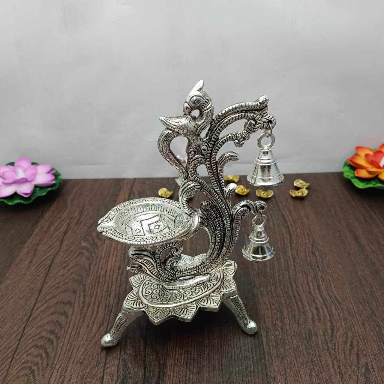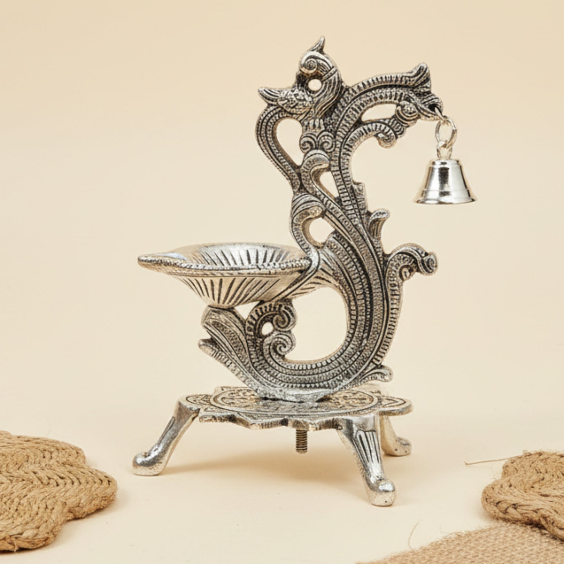 This beautifully crafted Antique Metal Samai Oil Lamp brings a traditional divine charm to your spiritual space. Designed with intricate carvings and a miniature hanging bell, this Samai is perfect for pooja rituals, diya lighting, home temple décor, or gifting during festivals.