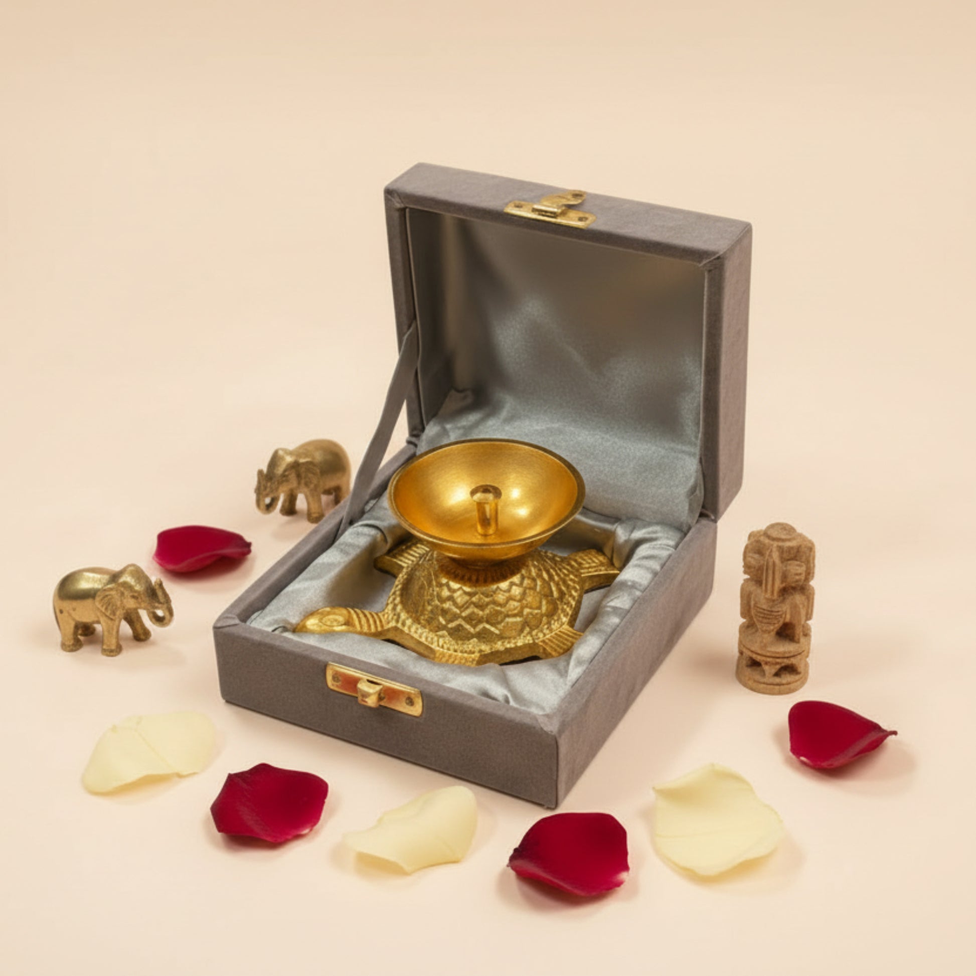 A traditional brass turtle-shaped diya with a polished golden finish, designed for lighting oil lamps during pooja and rituals. The turtle (Kachua) is considered an auspicious Vastu symbol representing stability, longevity, prosperity, and positive energy. Presented in a soft velvet-lined gift box, this diya is ideal for home temples, offices, Diwali, housewarming ceremonies, weddings, and spiritual gifting.